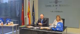 La consejera de Educación y Universidades de la Región de Murcia, María Isabel Sánchez-Mora, y el director territorial de 'CaixaBank' en Andalucía Oriental y Murcia, Juan Ignacio Zafra, han presentado este lunes la campaña 'Tu material estrella', que tiene como finalidad ayudar a las familias con menos recursos con la dotación de material escolar.