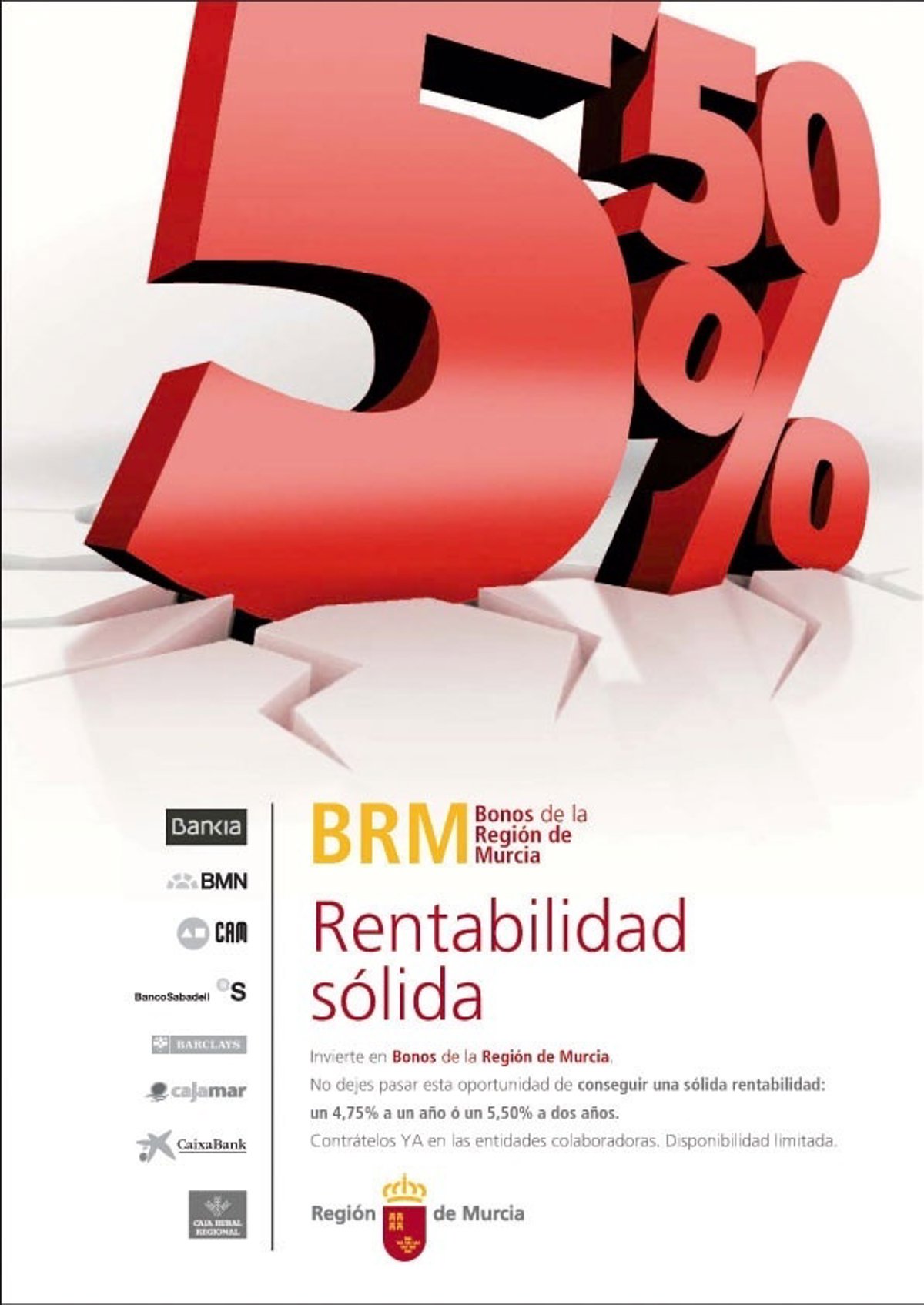 La Consejería de Economía y Hacienda ha hecho pública este martes la orden de emisión de Bonos de la Región de Murcia, que se comercializarán bajo el lema de 'Rentabilidad sólida', en referencia a la seguridad que ofrece y a la rentabilidad del 4,75 por ciento a un año y de 5,5 a dos años.