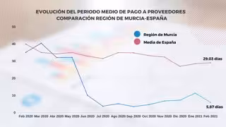 En cuanto a la comparativa con respecto a hace un año, los datos reflejan que, a la conclusión de febrero de 2020, el periodo medio de pago a proveedores era de 35 días en la Región, una cifra que superaba la media nacional y que se ha revertido en ese periodo de doce meses.