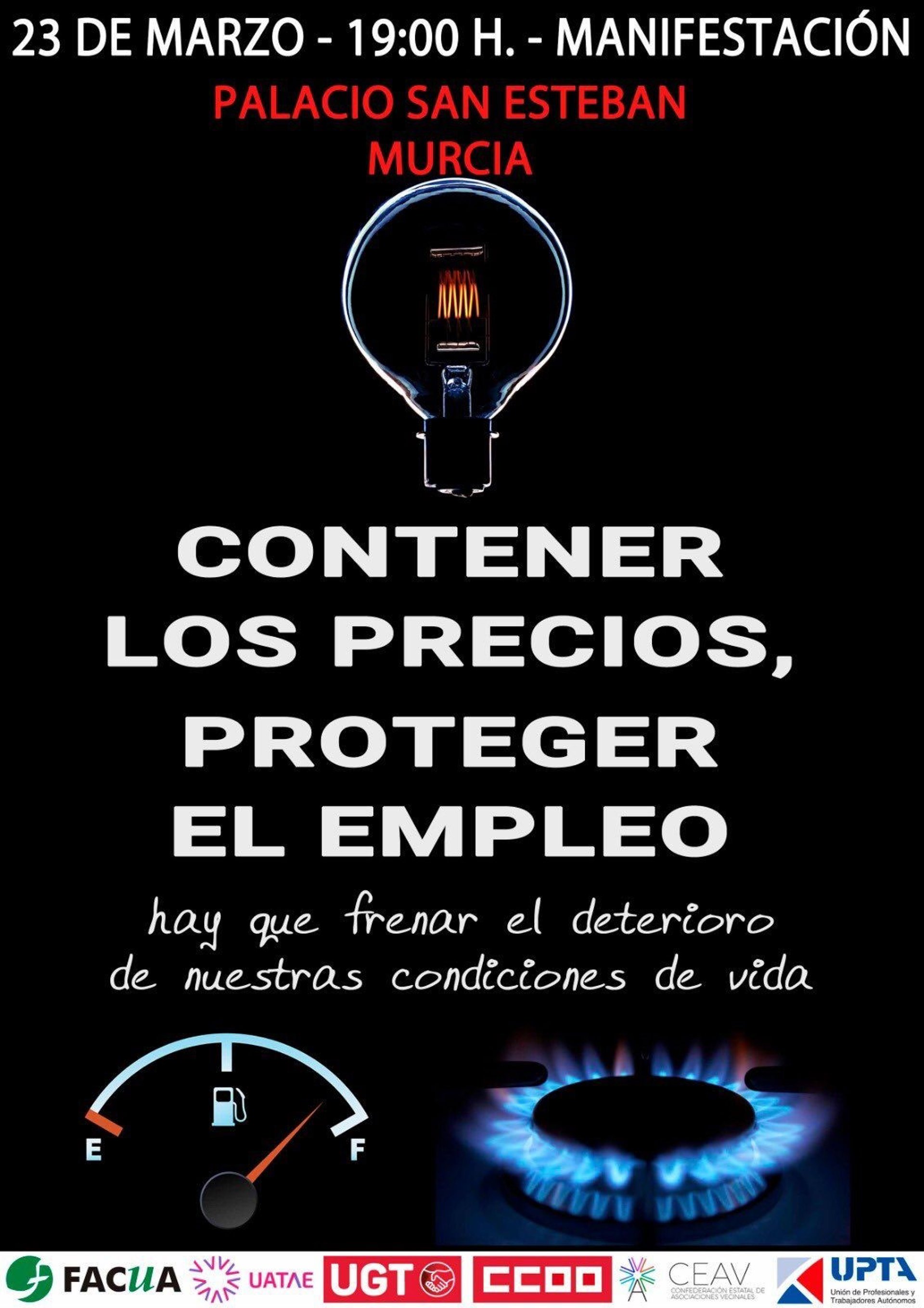 La concentración se ha desarrollado bajo el lema 'Contener los precios, proteger el empleo, frenar el deterioro de nuestras condiciones de vida'. La protesta ha estado organizada por FACUA-Consumidores en Acción, CCOO, UGT, la Confederación Estatal de Asociaciones Vecinales (CEAV) y las asociaciones de autónomos Uatae y UPTA