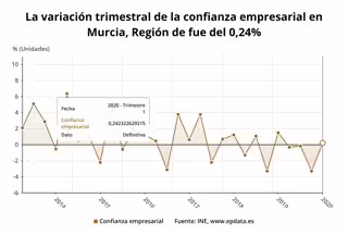 La confianza empresarial en la Región de Murcia ha aumentado un 0,2 por ciento en el primer trimestre de 2020, el cuarto mayor descenso por comunidades junto a Cataluña y Andalucía, frente al descenso de cuatro décimas de la media nacional, según el Indicador de Confianza Empresarial Armonizado (ICEA), cuya publicación corresponde al Instituto Nacional de Estadística (INE).
