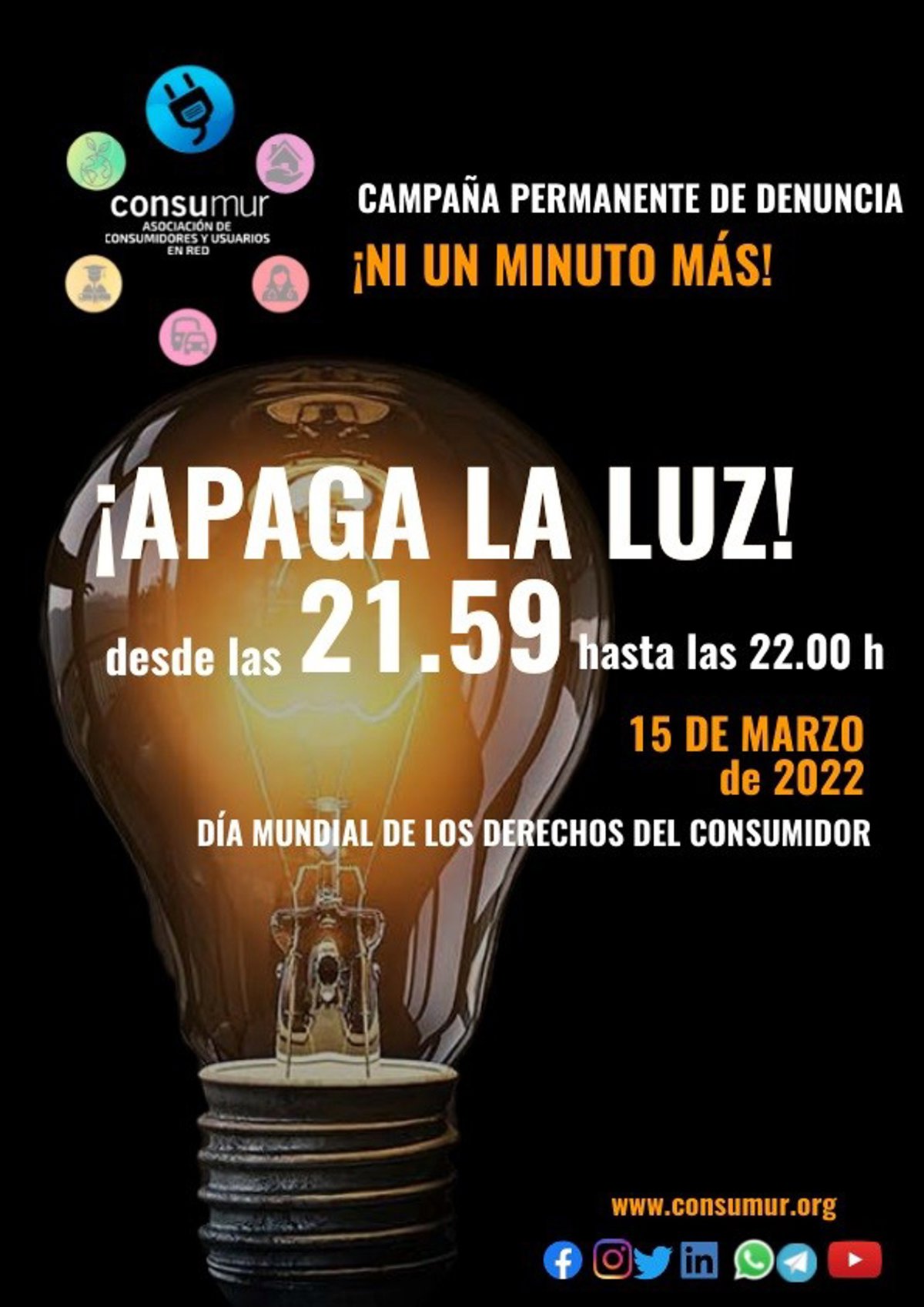 La Asociación de Consumidores y Usuarios en Red (Consumur) con motivo de la celebración este martes, 15 de marzo, del Día Mundial de los Derechos del Consumidor, ha puesto en marcha la Campaña de Denuncia Permanente ¡Ni un minuto más! en protesta por "los desorbitados precios" de la energía eléctrica y la "inacción del Gobierno central", según han informado fuentes de la organización en un comunicado.