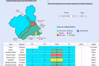 La Dirección General de Medio Ambiente y Mar Menor de la Consejería de Agua, Agricultura, Ganadería, Pesca y Medio Ambiente de la Región de Murcia ha comunicado al Ayuntamiento de Cartagena la bajada a nivel 1 preventivo de aviso por partículas suspensión (PM10) las zonas del Valle de Escombreras y Alumbres, al haberse producido ayer sábado medias diarias que se situaban por encima de los 45 y por debajo de los 50 microgramos de partículas en suspensión PM10 en las estaciones de estos dos emplazamientos.
