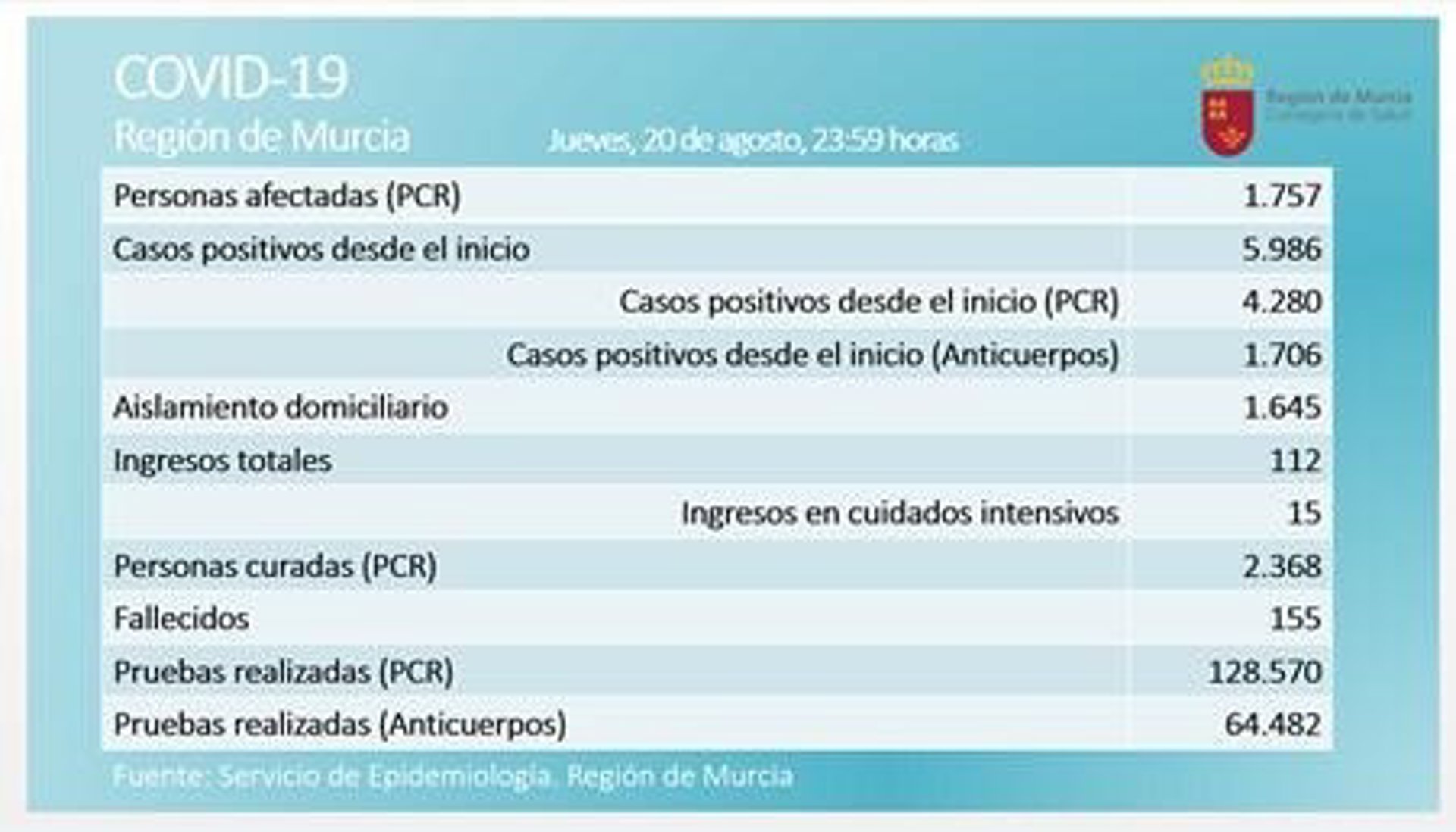 Tabla de los casos de covid-19 en la Región de Murcia - CARM