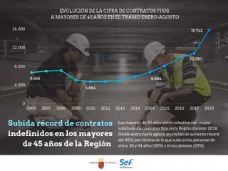 El repunte de estos vínculos laborales estables entre los mayores de 45 años también sobrepasa en casi 13 puntos el aumento medio en el conjunto de la población, que es del 33,56 por ciento con respecto a los primeros ocho meses de 2017. Por tanto, se trata del grupo de la población que se está beneficiando más intensamente del progresivo aumento de la contratación estable en la Región.