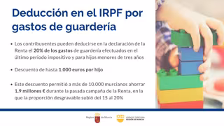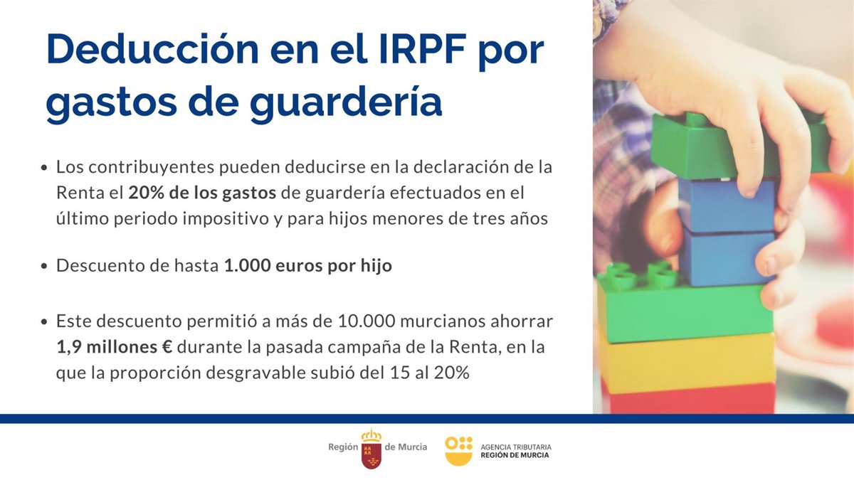 Los contribuyentes con residencia habitual en la Región de Murcia podrán deducirse en la inminente campaña de la Renta el 20 por ciento de los gastos de guardería efectuados en el último periodo impositivo y para hijos menores de tres años. El descuento será de hasta mil euros por hijo, con el requisito de que se conserven las facturas acreditativas de los gastos.