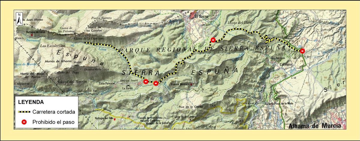 El tramo de carretera que conecta el refugio de la Casa Leyva con Huerta Espuña a través de las denominadas Cuestas del Marqués y el puente de La Mezquita dentro del Parque regional de sierra Espuña, en el término municipal de Alhama de Murcia, ha quedado cerrado al tráfico de forma temporal.