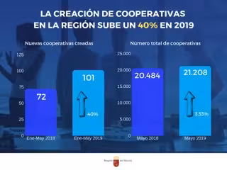 Los primeros cinco meses del año han dejado en la Región de Murcia un total de 101 nuevas cooperativas, frente a las 72 que se constituyeron en el mismo periodo de 2018. Así, los datos registrados en este periodo por la Consejería de Empleo, Universidades, Empresa y Medio Ambiente reflejan una subida del 40 por ciento en la creación de estas sociedades.