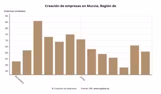 La creación de nuevas empresas en Murcia subió un 1,37 por ciento en diciembre en tasa interanual con un total 222 sociedades mercantiles constituidas, en un mes en el que las empresas disueltas fueron 44, un 10,2 por ciento menos, según los datos difundidos este martes por el Instituto Nacional de Estadística (INE).