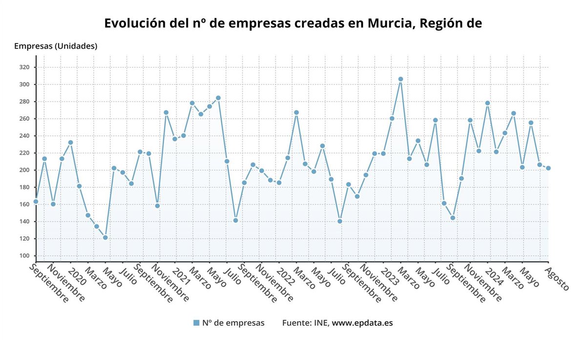 MADRID/MURCIA, 10 Oct. (EUROPA PRESS) - La creación de nuevas empresas en la Región de Murcia subió un 25,5% en agosto en tasa interanual con un total 202 sociedades mercantiles constituidas, en un mes en el que las empresas disueltas fueron 22, un 29% menos, según los datos difundidos este martes por el Instituto Nacional de Estadística (INE).