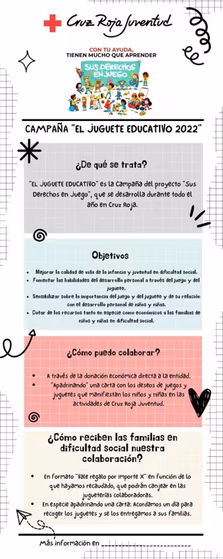 Cruz Roja Juventud ha arrancado la edición 2022/2023 de su campaña del juguete educativo con el lema 'Sus derechos en juego'. Su intención es alcanzar los 120.000 juegos y juguetes nuevos, no sexistas y no bélicos que se entregarán a las familias de 70.000 niños y niñas en situación de vulnerabilidad, 500 de ellas en la Región de Murcia.