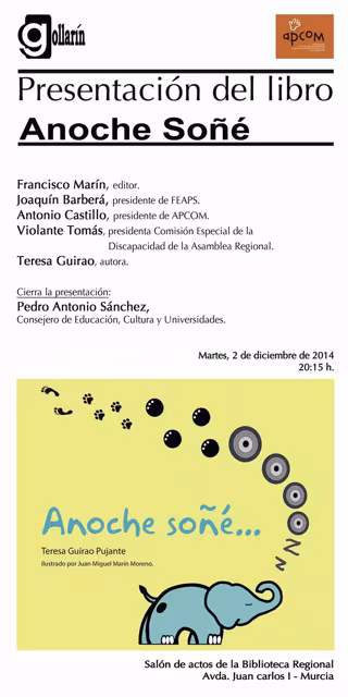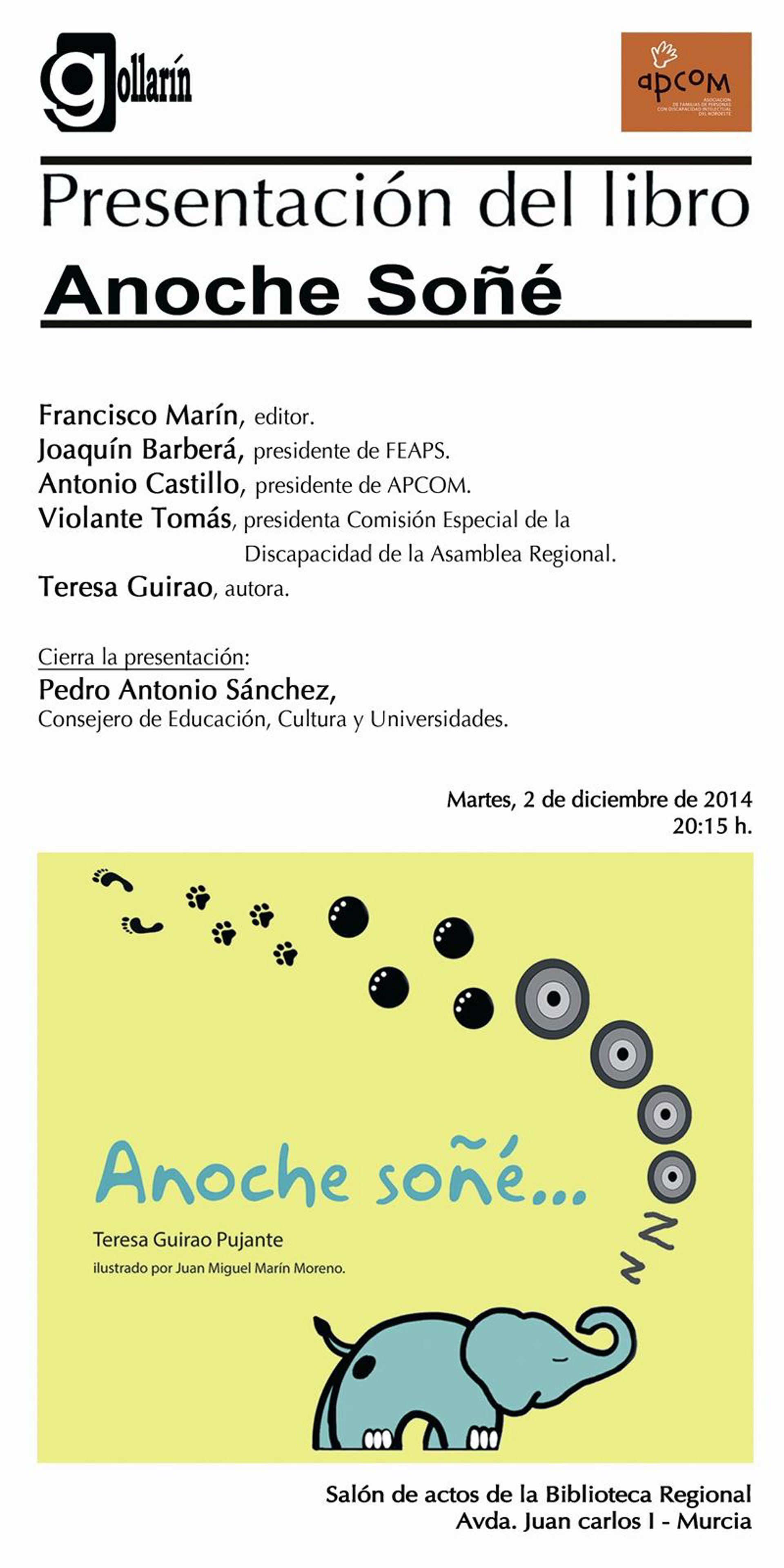 'Añoche soñé...', de Teresa Guirao (con ilustraciones de Juan Miguel Marín), es el primer cuento infantil editado por la editorial caravaqueña Gollarín en colaboración con APCOM, y cuyos ingresos se destinarán al colectivo Voluntarios que prestan ayuda a las personas con discapacidad.
