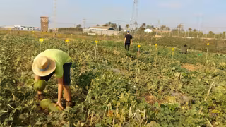 Trabajos de recogida de melón en la parcela asociada al cultivo de caupí - UPCT