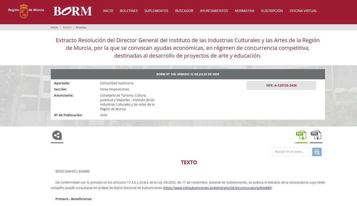 La convocatoria puede consultarse en el Boletín Oficial de la Región de Murcia (BORM), así como en el apartado de convocatorias dentro de la web del Instituto de las Industrias Culturales y las Artes.