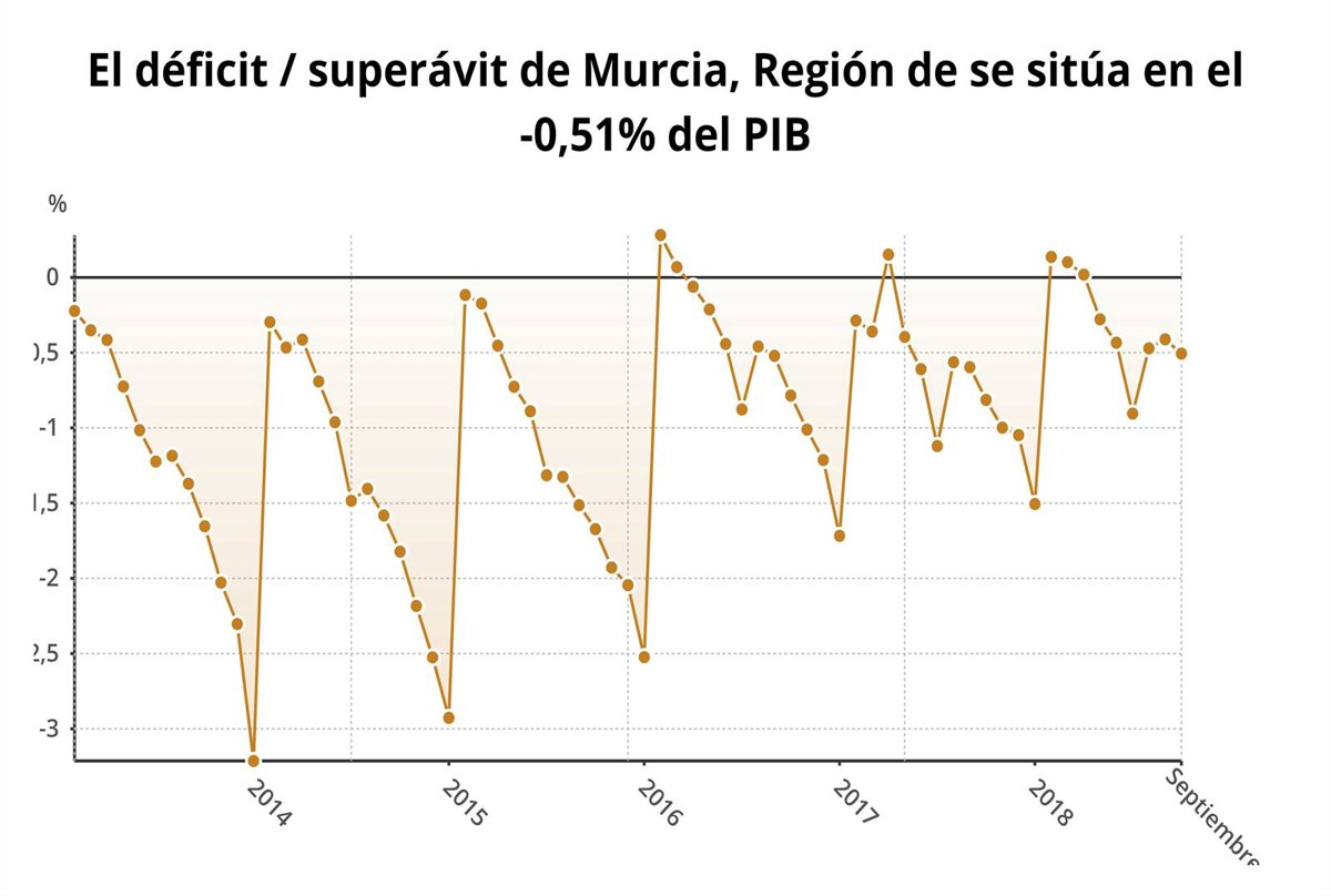 Sin embargo, Murcia desciende su déficit, que era del 0,80 por ciento de su PIB (242 millones de euros) en septiembre de 2017, a los 160 millones este año.