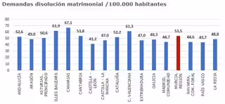 En relación a las demandas de disolución matrimonial del total del año con la población a 1 de enero de 2022, el mayor número de demandas de disolución por cada 100.000 habitantes se ha registrado en Canarias, con 67,1; Baleares, con 61,9; Comunidad Valenciana, con 61,3; Cantabria, con 53,8; Murcia, con 53,5; Andalucía, con 52,6, y Cataluña, con 52,2. Todas estas Comunidades Autónomas se sitúan por encima de la media nacional, que ha sido de 51,4 demandas de disolución matrimonial por cada 100.000 habitantes.