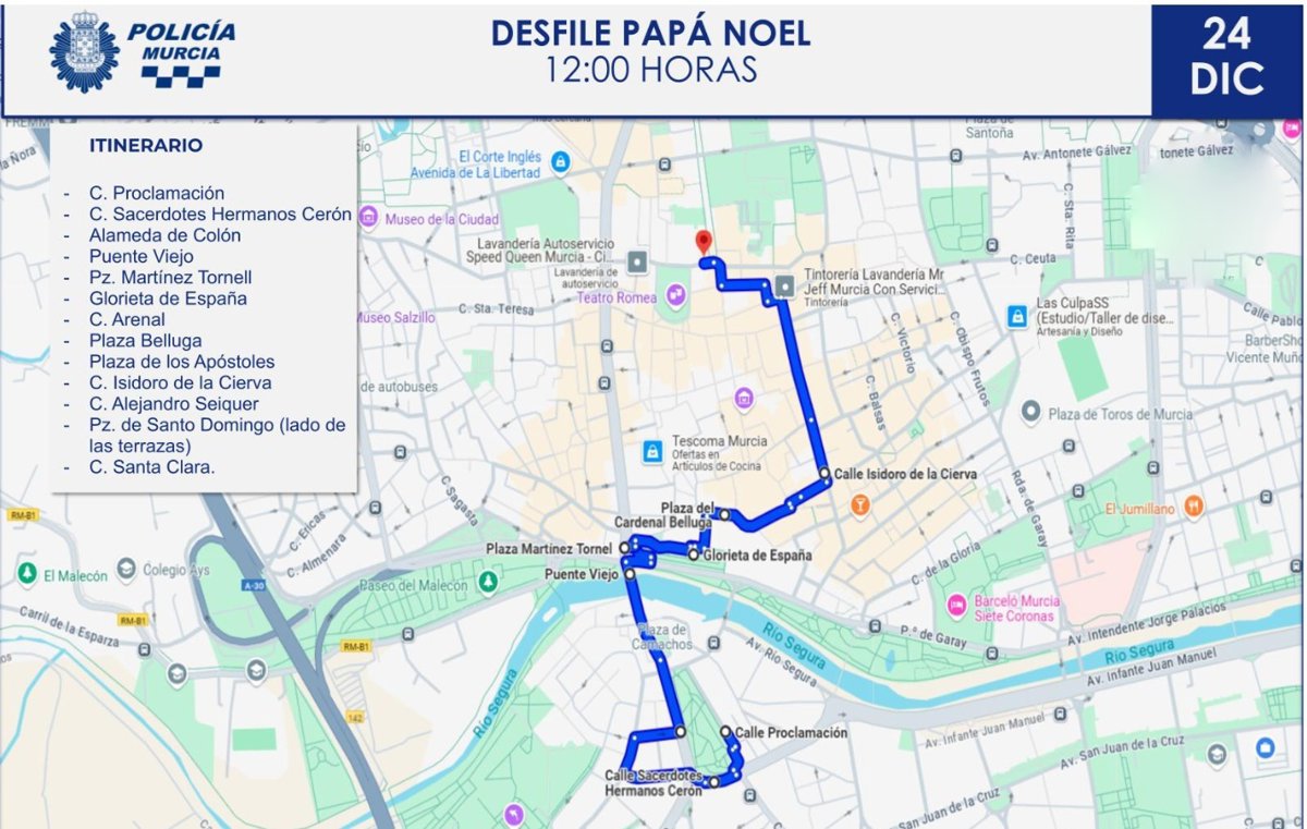 Itinerario del desfile de llegada de Papá Noel a la ciudad de Murcia - WEB POLICÍA LOCAL DE MURCIA
