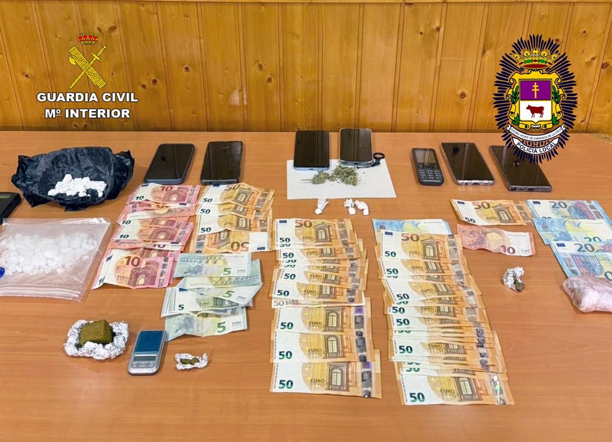 Recientemente, se estableció un dispositivo policial conjunto, formado por agentes de la Guardia Civil y de la Policía Local de Caravaca de la Cruz, en el que se practicó el registro simultáneo de los cuatro inmuebles donde fueron incautados 40 gramos de cocaína, 116 gramos de metanfetaminas y 88 gramos de hachís, además de los útiles necesarios para su dosificación y venta; y 2.000 euros en billetes de distinto valor.