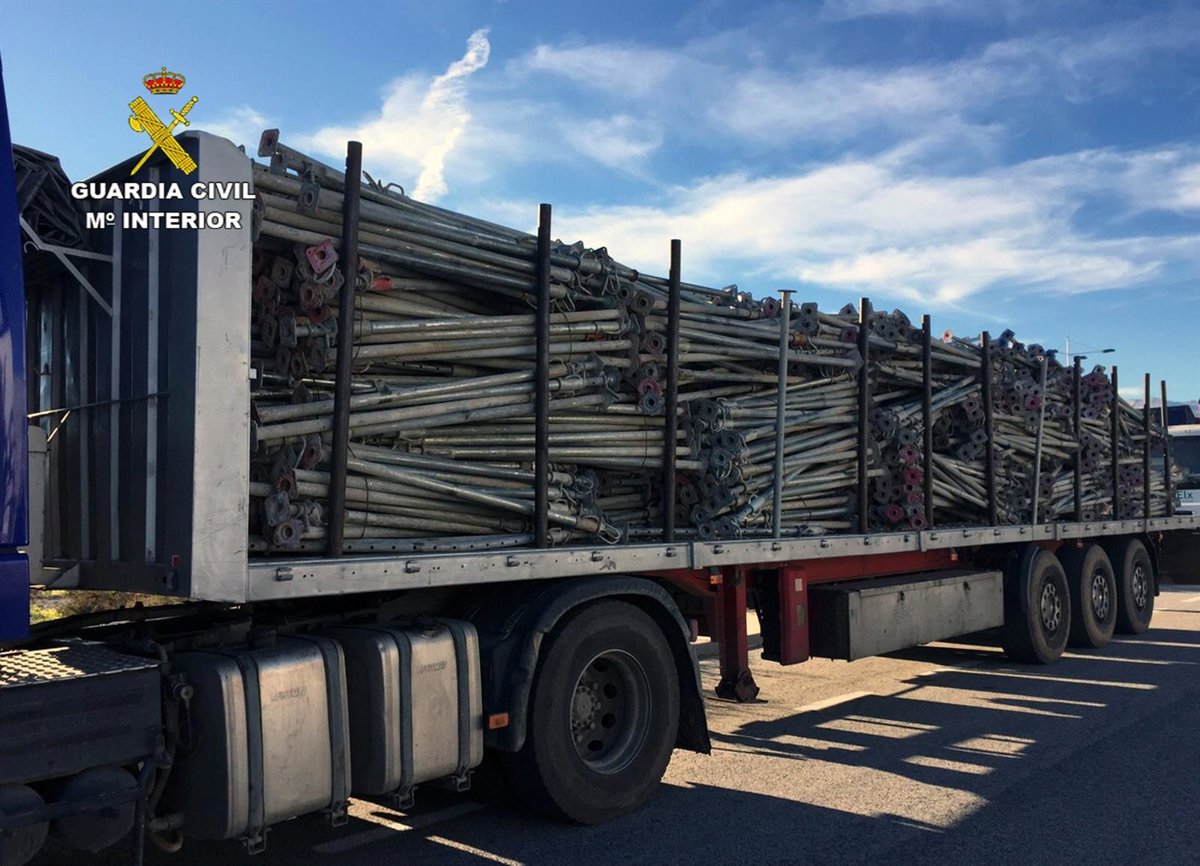 Las pesquisas practicadas permitieron a la Benemérita ubicar parte de los materiales -ya desguazados y prácticamente inservibles- en una chatarrería del entorno de Cartagena, así como interceptar, en ruta, a dos camiones que circulaban con destino a Madrid con cerca de 50 toneladas de puntales metálicos, por lo que fueron intervenidos y entregados a su legítimo propietario.
