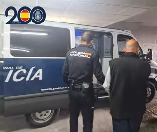 El detenido, esposado, es conducido por un agente al furgón policial - POLICÍA NACIONAL