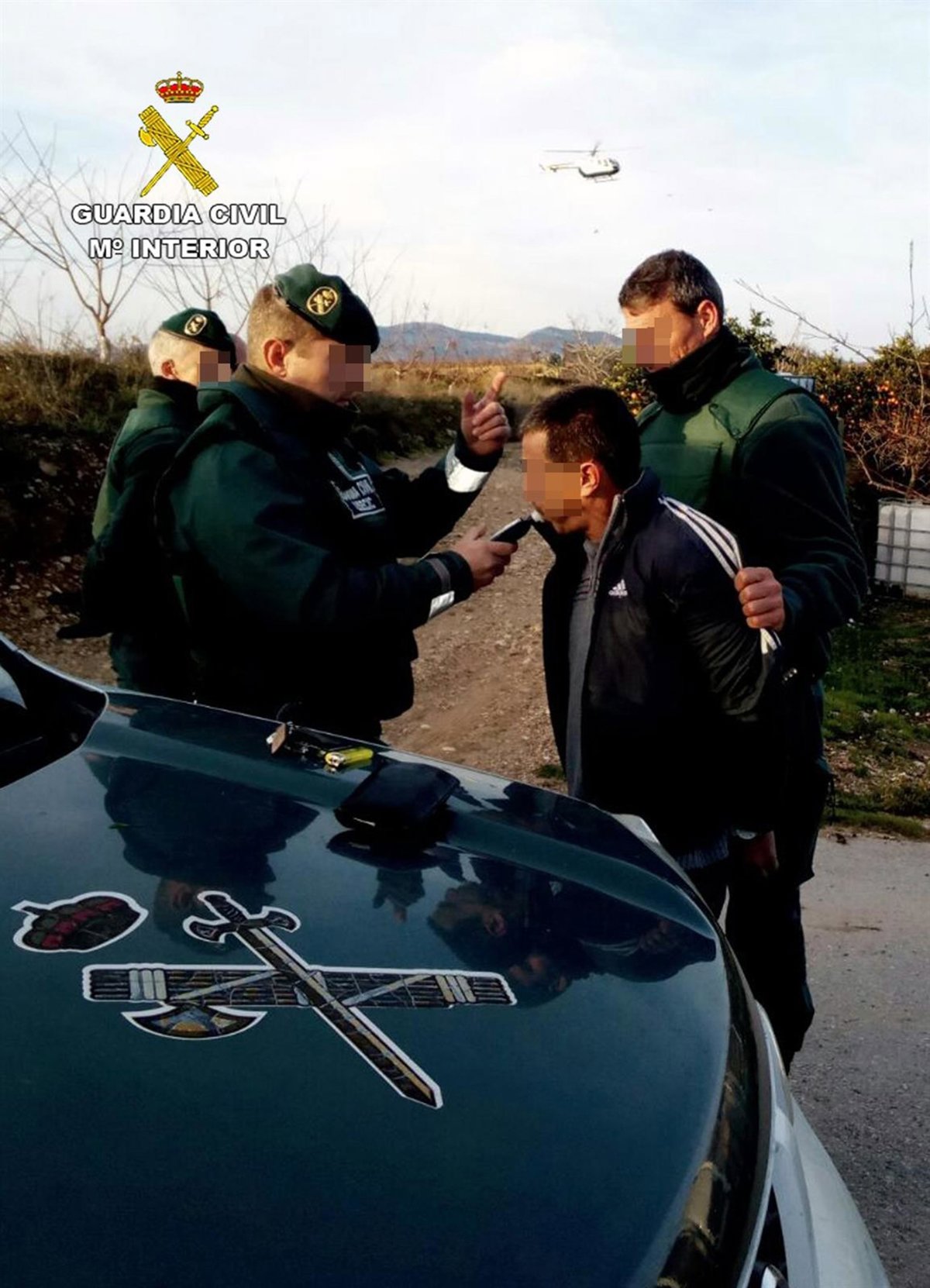 Las patrullas terrestres y el helicóptero de la Guardia Civil, alertados por la inminente fuga, iniciaron un seguimiento sobre el vehículo por el casco urbano de la localidad y sus extrarradios hasta que éste llegó a un camino sin salida. Su conductor abandonó entonces el vehículo y emprendió huida a pie introduciéndose por un cañaveral, donde se intentó ocultar.
