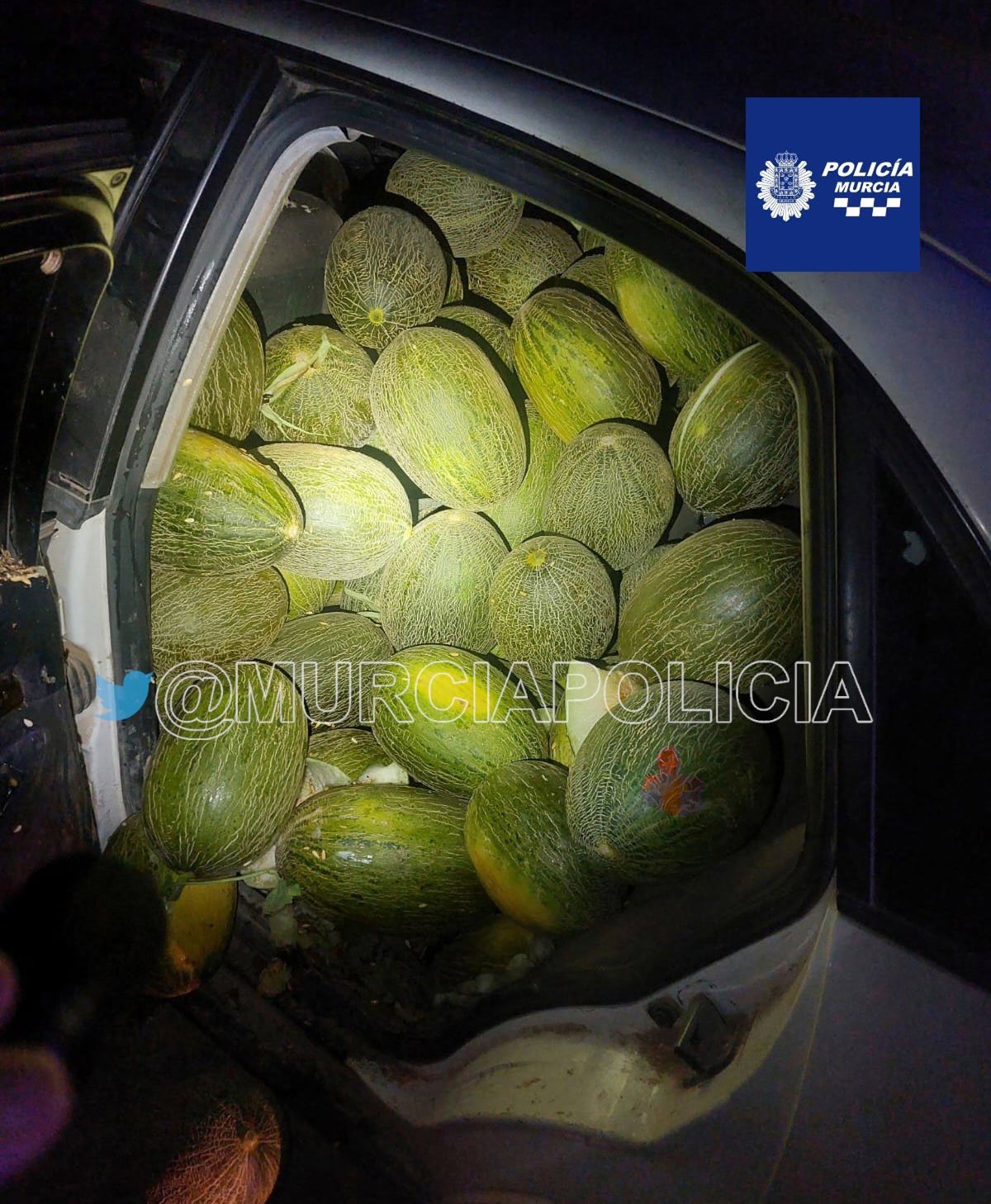 La Policía Local de Murcia ha detenido esta madrugada a dos individuos en la pedanía murciana de Lobosillo al ser sorprendidos viajando en un coche con gran cantidad de melones robados.