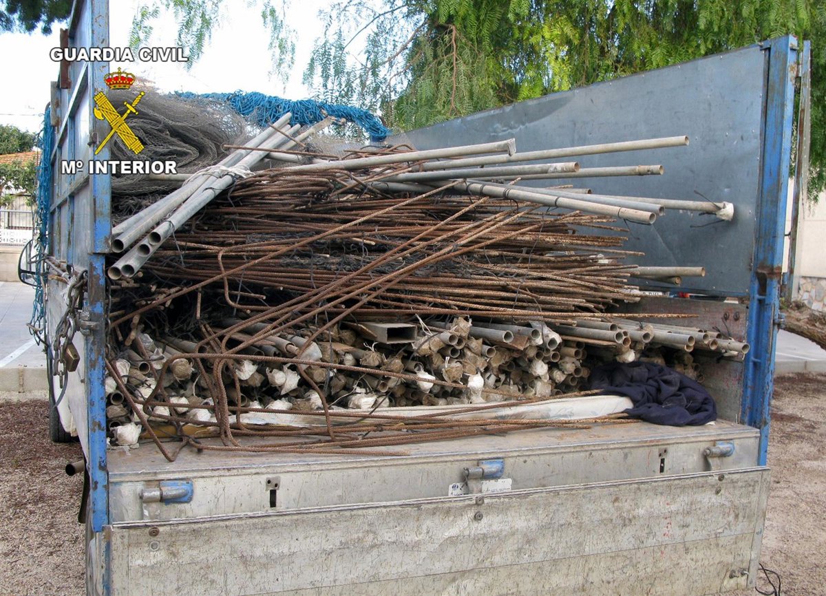 Los agentes reconocieron la zona, logrando interceptar el vehículo e identificar a sus ocupantes. En el interior de la furgoneta se encontró gran cantidad de tubos galvanizados, clavillas, herramientas de corte, alambrada y otros efectos propios de las instalaciones de invernaderos agrícolas.