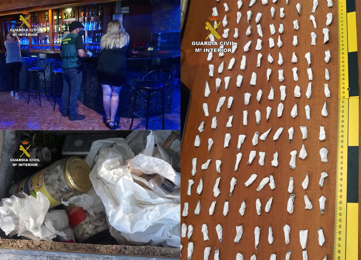 En el interior del club, la Guardia Civil halló tres dosis de cocaina escondidas en un habitáculo del tejado de un patio trasero que, a su vez, comunicaba con un camino vecinal por una puerta secundaria. A unos diez metros aproximadamente, ocultas en una arqueta de riego, los investigadores hallaron gran cantidad de dosis de cocaína, idénticas a las anteriores y parte de esta sustancia presentada en 'roca', así como dos básculas de precisión utilizadas para la manipulación de la droga.