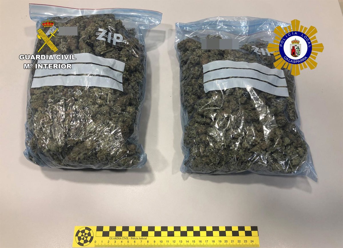 La Guardia Civil de la Región de Murcia y la Policía Local de Calasparra han detenido a dos vecinos de este municipio, de 21 y 36 años y con antecedentes, que fueron sorprendidos en un control preventivo con más de medio kilo de marihuana dispuesta en cogollos que trataban de ocultar entre herramientas.