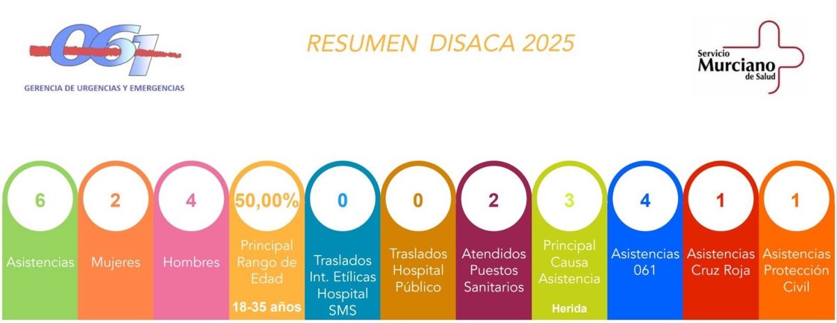 El dispositivo sanitario desplegado esta martes por la ciudad de Murcia con motivo del Bando de la Huerta 2025 ha realizado, hasta las 12.00 horas, un total de seis asistencias de carácter leve, según han informado fuentes del Centro de Coordinación de Emergencias.
