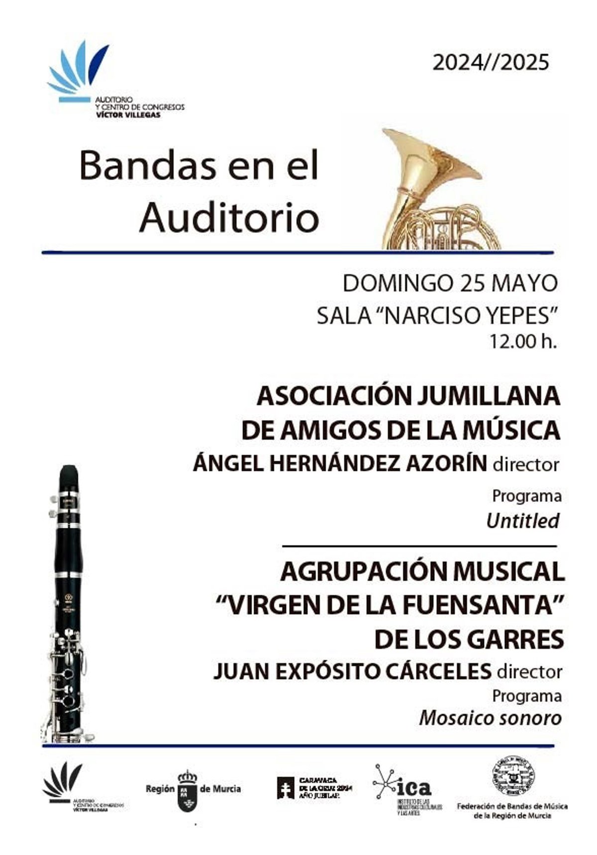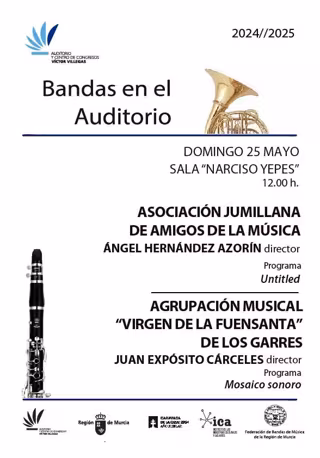 Será a las 12.00 horas cuando tome el escenario de la Sala Narcisos Yepes la Asociación Jumillana de Amigos de la Música bajo la dirección de Ángel Hernández Azorín. Tras esta actuación, será el turno de la Agrupación Musical Virgen de la Fuensanta de Los Garres que realizará el programa titulado 'Mosaico sonoro', con Juan Expósito Cárceles a la batuta.