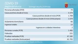 La Región de Murcia ha registrado dos nuevos afectados en las últimas 24 horas, según el balance correspondiente a las 23.59 horas de este domingo publicado por la Consejería de Salud.