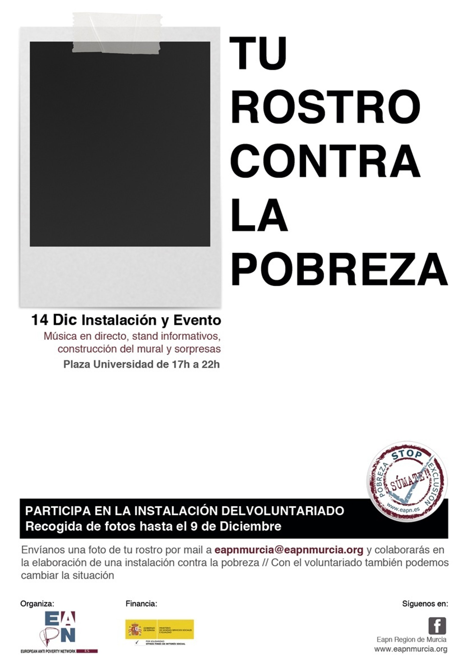 La Red de Lucha contra la Pobreza y la Exclusión Social de la Región de Murcia (EAPN) ha convocado este viernes por la tarde un acto que consistirá en colgar cientos de fotos de personas en las columnas de la Plaza de la Universidad de Murcia contra la pobreza