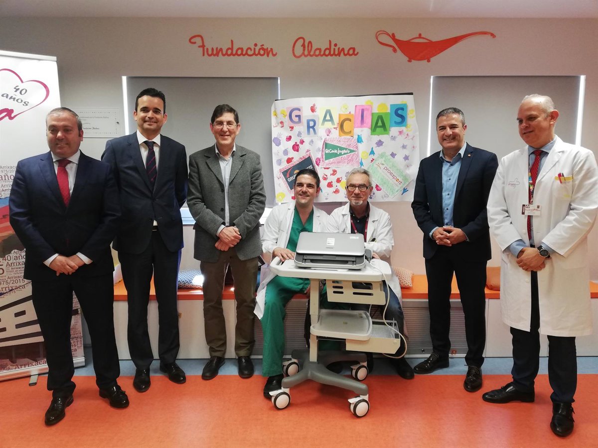 Un nuevo ecógrafo, donado al Hospital Virgen de la Arrixaca por tres empresas vinculadas a la Región, va a permitir mejorar el tratamiento contra el cáncer a los cerca de 70 niños a los que cada año se diagnostica esta enfermedad.