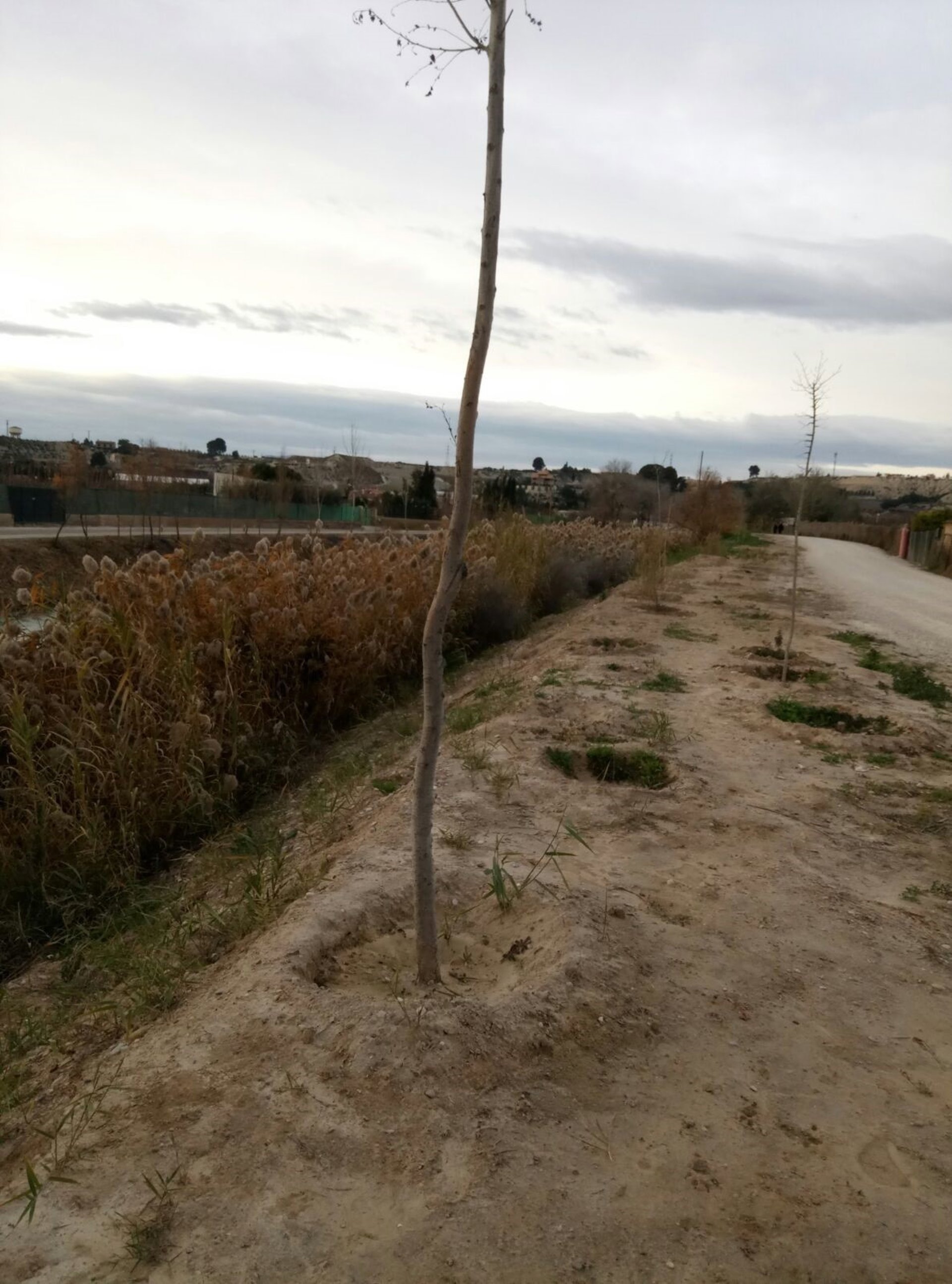 Los ecologistas explican que los trabajos ahora realizados consistían en reponer los fallos de la planta, pero lo que se ha hecho ha sido sustituir árboles secos de 4 metros de altura, por ejemplares de alveolo que apenas levantan del suelo unos centímetros.