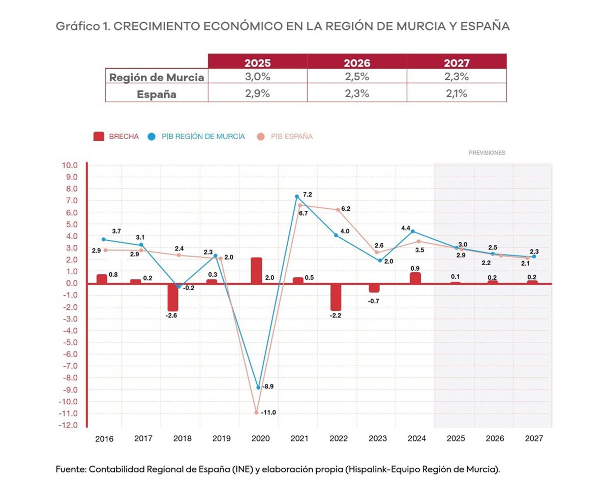 Pese a la incertidumbre global, se estima que el Producto Interior Bruto (PIB) de la Región de Murcia aumentó un 3% en 2025, cifra "levemente" superior al incremento del PIB español, previéndose un incremento del 2,5% y del 2,3%, respectivamente, en los dos siguientes ejercicios, según informaron fuentes de Fidedigno en un comunicado.