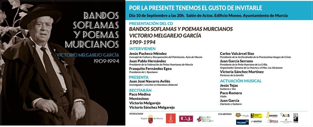 El salón de actos del edificio Moneo de Murcia acogerá el próximo martes, 10 de septiembre, un acto de homenaje al panochista y defensor del patrimonio regional Victorio Melgarejo García (1909-1994), en el que se dará a conocer un CD editado con sus mejores recitaciones en panocho.