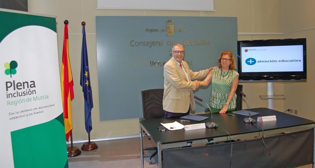 La consejera, María Isabel Sánchez-Mora, y el presidente de Plena inclusión Región de Murcia, Joaquín Barberá, han formalizado este miércoles el convenio a través del cual se financian actividades de apoyo educativo específico a través de programas de intervención en los centros educativos.