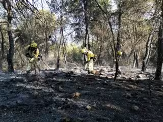 Esta mañana permanecían en el lugar el técnico de extinción y Unidad de Coordinación de la Dirección General del Medio Natural (DGMN); y cuatro brigadas forestales con sus respectivos vehículos automomba y agentes medioambientales de la DGMN.