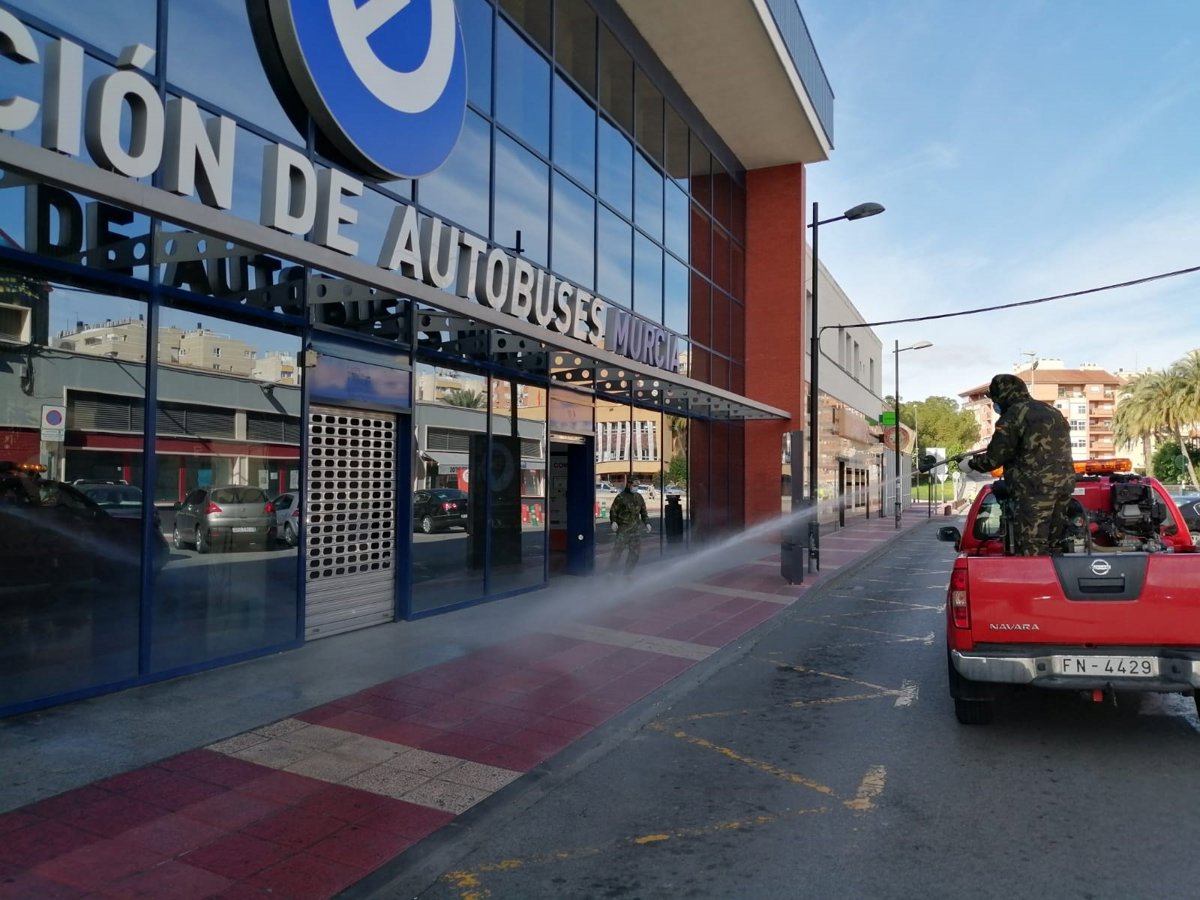 Unos 40 efectivos del Tercio de Levante realizan este martes labores de desinfección en las estaciones de autobuses y tren de los municipios de Murcia, Cartagena y Águilas, informaron fuentes de la Armada en un comunicado.