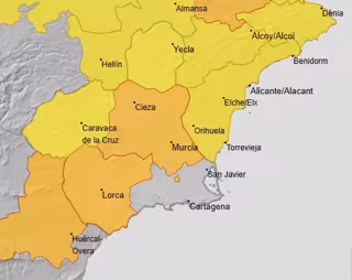 La Agencia Estatal de Meteorología (Aemet) ha elevado a naranja su aviso por tormentas y lluvias para este jueves por la tarde en la Vega del Segura y el Valle del Guadalentín, Lorca y Águilas.