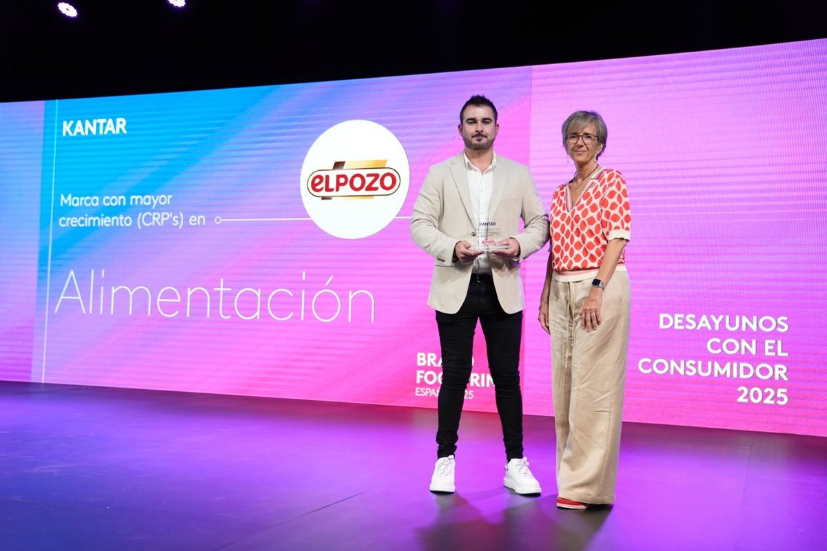 La marca ELPOZO se ha convertido en la enseña de alimentación con la mejor evolución del mercado, según demuestra el ranking Kantar Brand Footprint 2025 elaborado por la consultora Kantar Worldpanel, el mayor estudio de marcas de gran consumo basado en compras reales durante el pasado año, y por lo que ha sido reconocida. El galardón lo ha recogido el director de marketing de la compañía, Pablo Olivares, de mano de María Josep Martínez, directora general de Worldpanel.