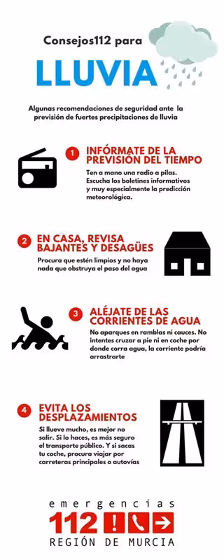 La Dirección de Seguridad Ciudadana y Emergencias de la Región de Murcia ha emitido una serie de medidas de autoprotección a adoptar en caso de emergencia por lluvias intensas como, por ejemplo, abandonar cuanto antes los sótanos y plantas bajas si llega a inundarse una vivienda, así como desconectar la energía eléctrica utilizando, preferentemente, linternas para el alumbrado.