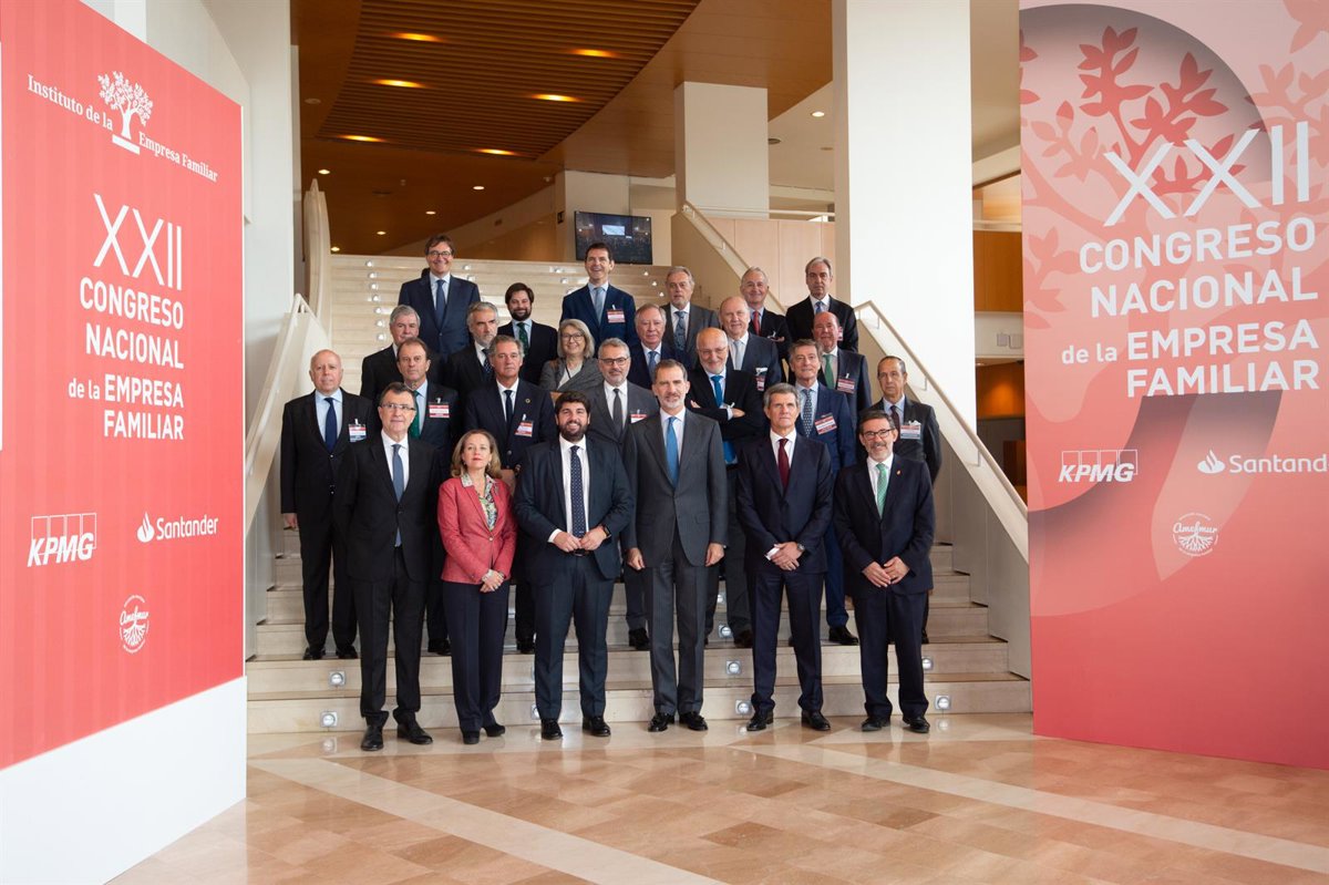 Foto de familia del XXII Congreso Nacional de la Empresa Familiar. En la primera fila, la ministra de Economía en funciones, Nadia Calviño (2i); el presidente de la Región de Murcia, Fernando Lpez Miras (3i); el Rey Felipe VI (4i); y el presidente del - Javier Carrión - Europa Press