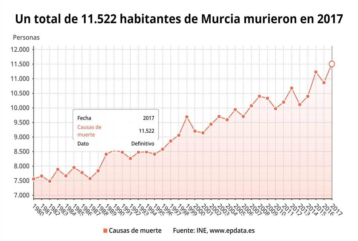 Un total de 11.522 habitantes de la Región de Murcia murieron en 2017 frente a los 10.867 de 2016, según reflejan los últimos datos publicados por el Instituto Nacional de Estadística (INE) publicados este miércoles.