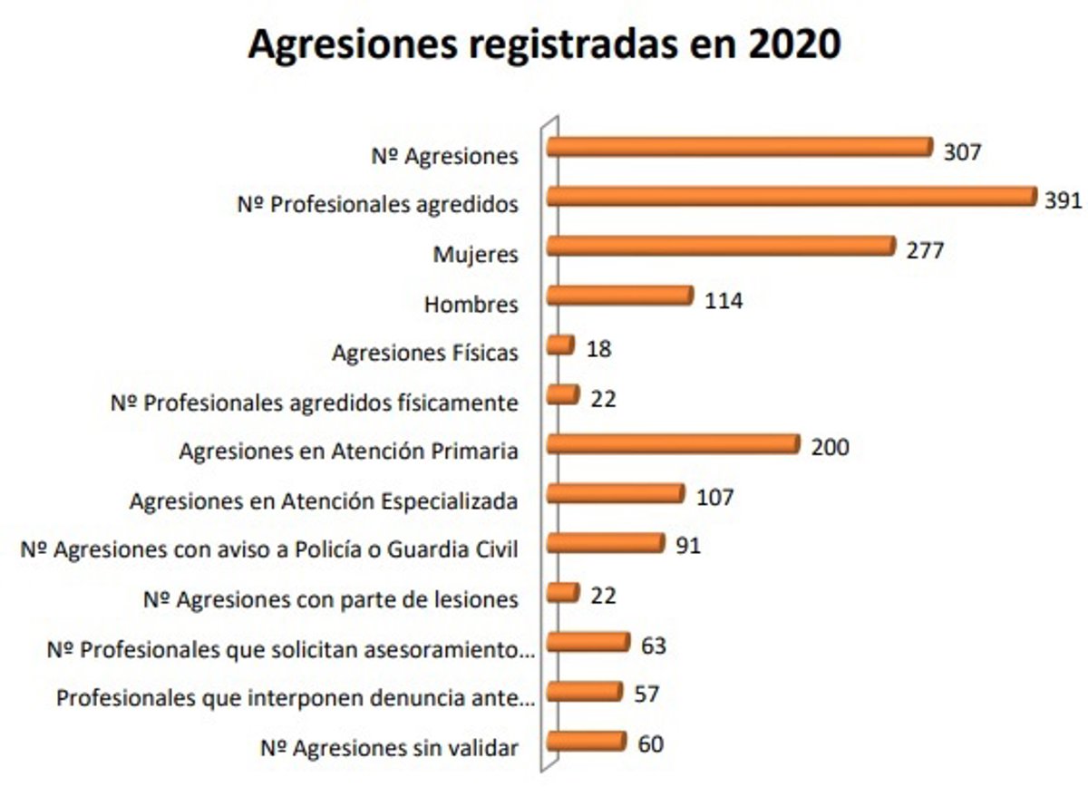 En total en 2020 resultaron agredidos 391 profesionales, cifra que desde el Colegio Oficial de Enfermería de la Región de Murcia considera "altísima e intolerable", más si cabe cuando 2020 "ha sido el año en el que la pandemia por SARS-CoV-2 ha obligado a realizar consultas telemáticas, reduciendo mucho la asistencia de los usuarios a los centros de atención primaria y especializada".