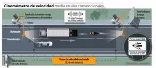 En este tipo de radares todos los sensores están interconectados, de modo que no sirve de nada cambiarse de carril, ni frenar justo antes de la cámara instalada al final del tramo, ya que lo que mide es la velocidad media a la que se circula por dicho tramo.