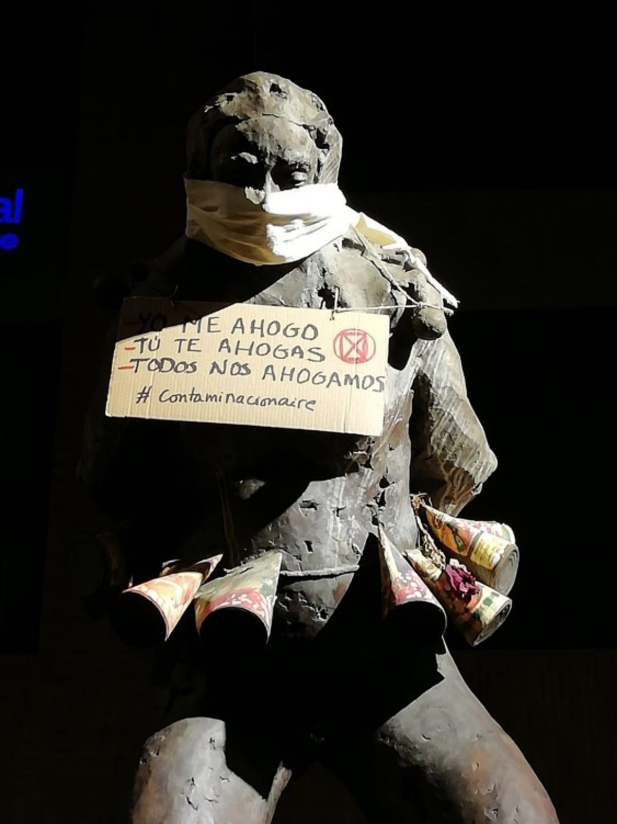 Estatuas y esculturas situadas en la vía pública del municipio de Murcia han amanecido este sábado con carteles reivindicativos que protestan contra la contaminación atmosférica.