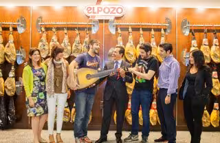 Estopa, integrado por los hermanos Muñoz, han visitado las instalaciones de ElPozo Alimentación para conocer de primera mano cómo se trabaja en la empresa líder en soluciones de alimentación con base de proteína cárnica y buque insignia del holding Grupo Fuertes y han estrenado la guitarra de jamón de la firma de alimentación.