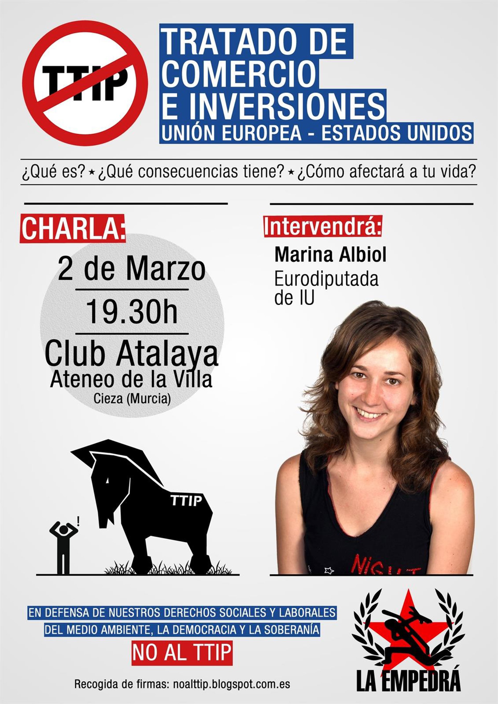 La eurodiputada Marina Albiol imparte este lunes, a las 19.30 horas, en el Club Atalaya de Cieza, una conferencia sobre el TTIP organizada por La Empedrá, según han informado fuentes de la organización en un comunicado.